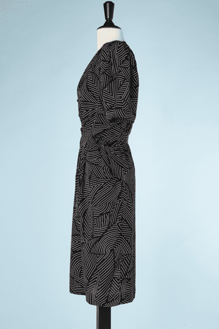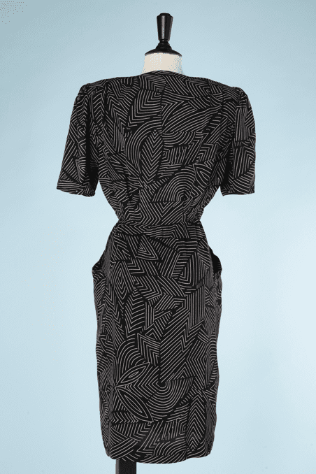 Robe 1980 Emanuel Ungaro noire et motifs géométriques blancs, construite comme une Robe des années 1940, manches courtes épaulées, taille cintrée, larges poches