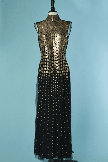 Étiquette : Robe Alberta Ferretti en tulle noir brodée de paillettes or
