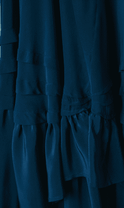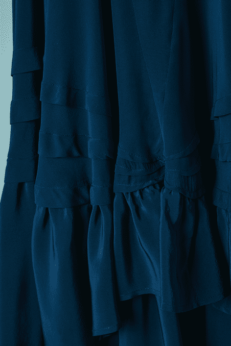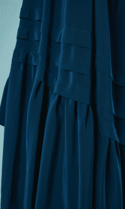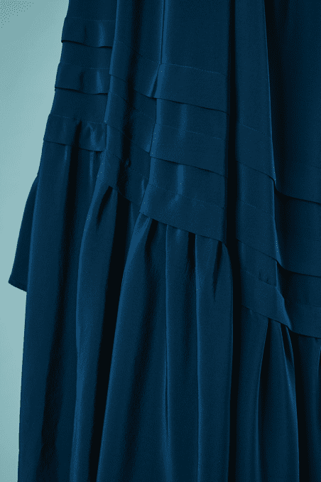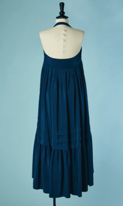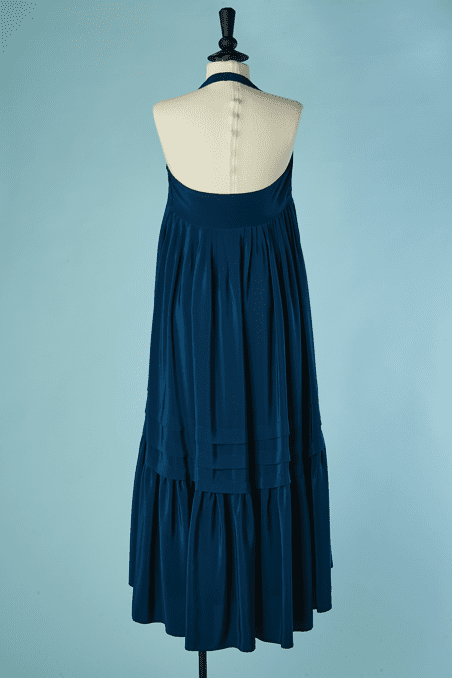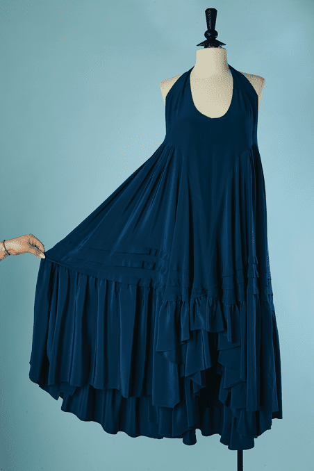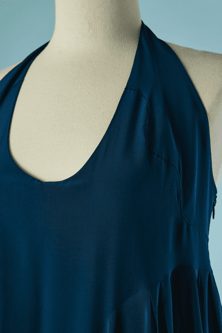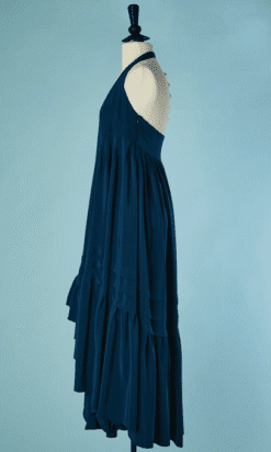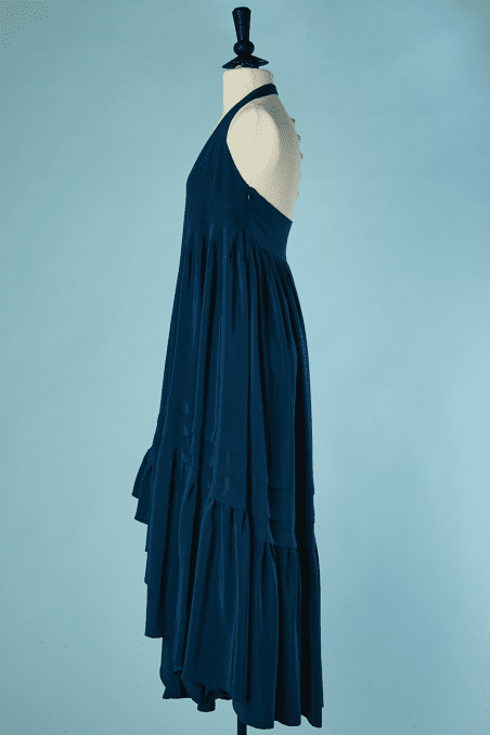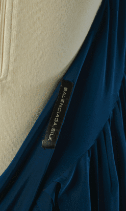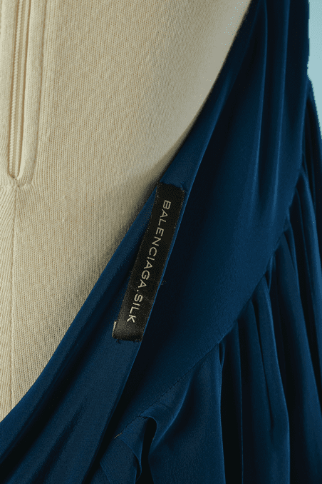 Robe Balenciaga en soie bleu nuit, sans manches, encolure ovale, poitrine moulée puis très évasée, plis et large volant, mi- dos nu, étiquette noire et écrue