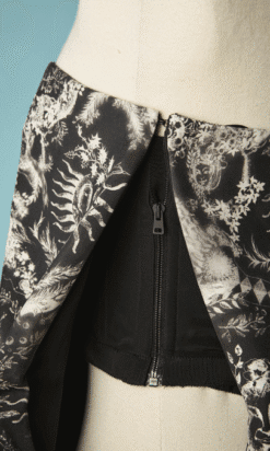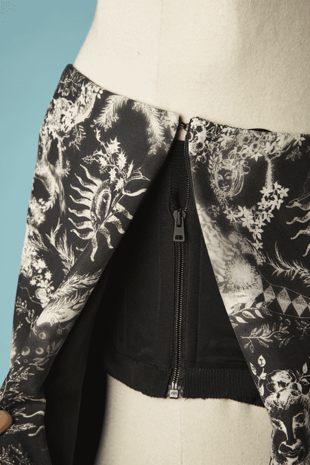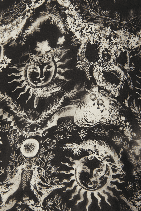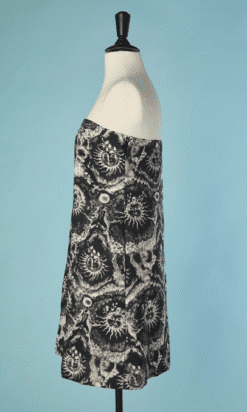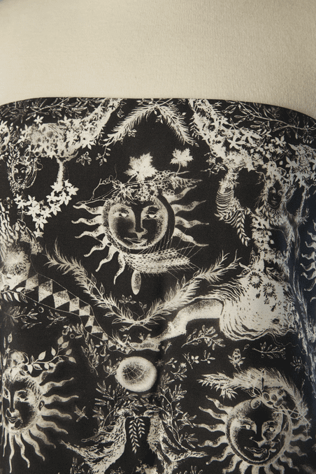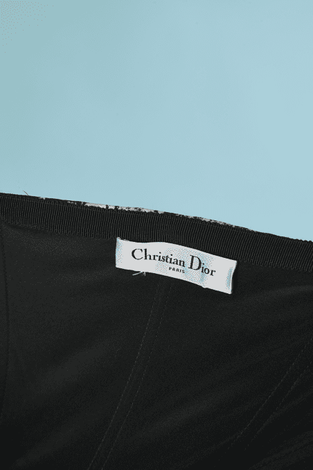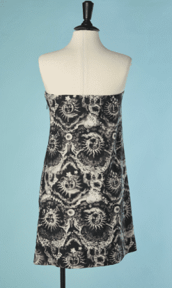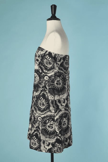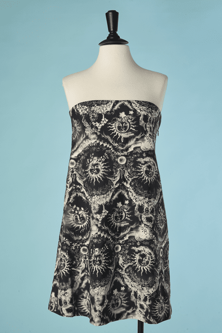 Robe bustier Christian Dior par Maria Grazia Chiuri en coton noir et blanc imprimé de soleils, corseterie noire intégrée, fermeture éclair sur le côté, doublure noire, étiquette blanche et noire