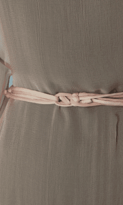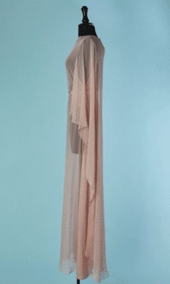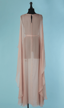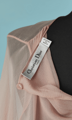 Robe longue Christian Dior par Maria Grazia Chiuri, du soir, en mousseline rose, larges manches longues papillons, ceinture en satin rose, encolure ras de cou, échancrure sur la nuque fermée par un bouton, étiquette blanche et noire