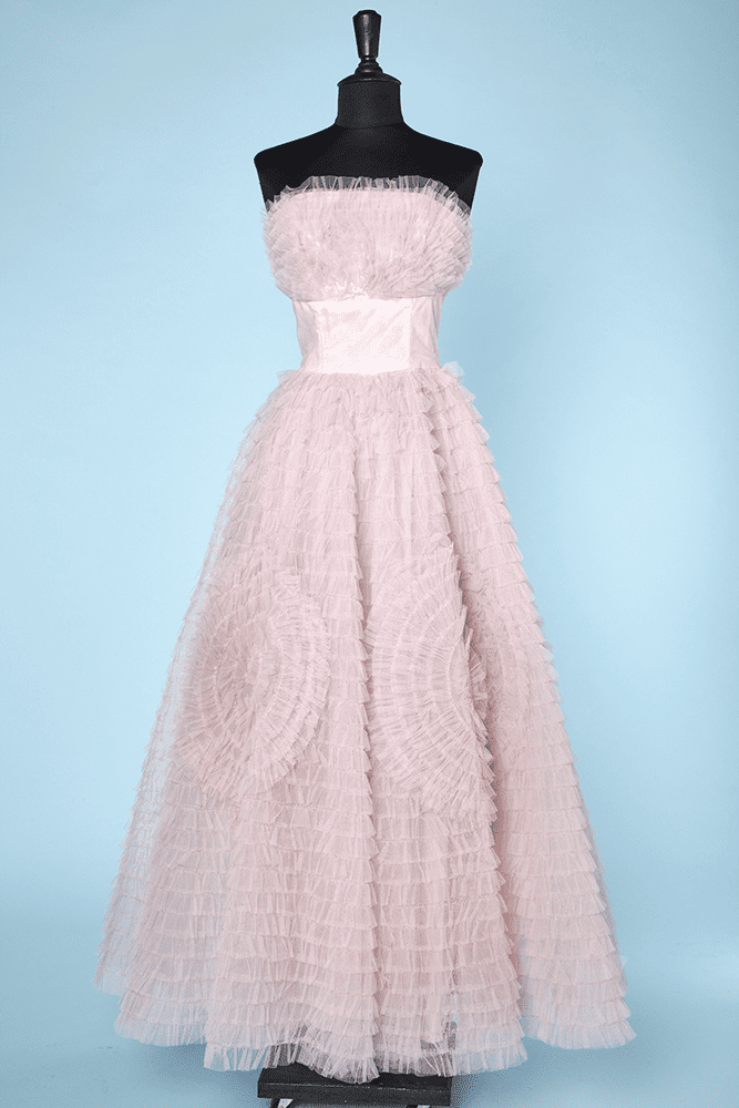 Robe bustier en tulle rose de bal 1950 entièrement cousue de volants de tulle à l’exception d’une large ceinture en rayonne rose.