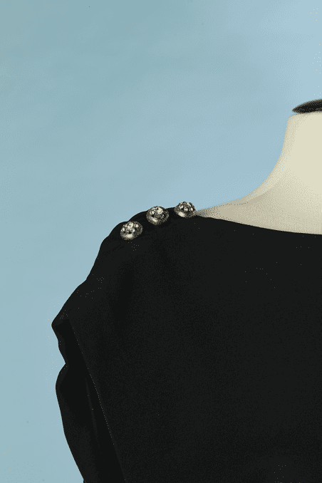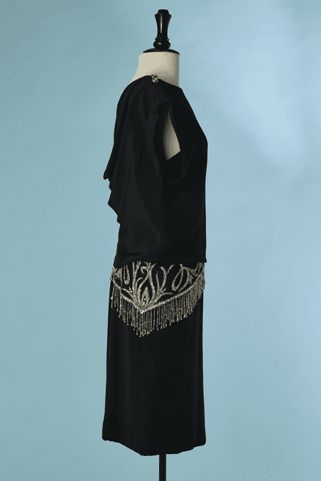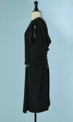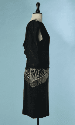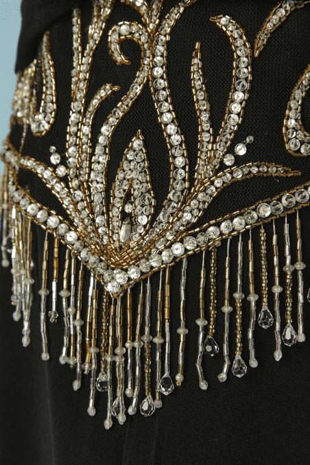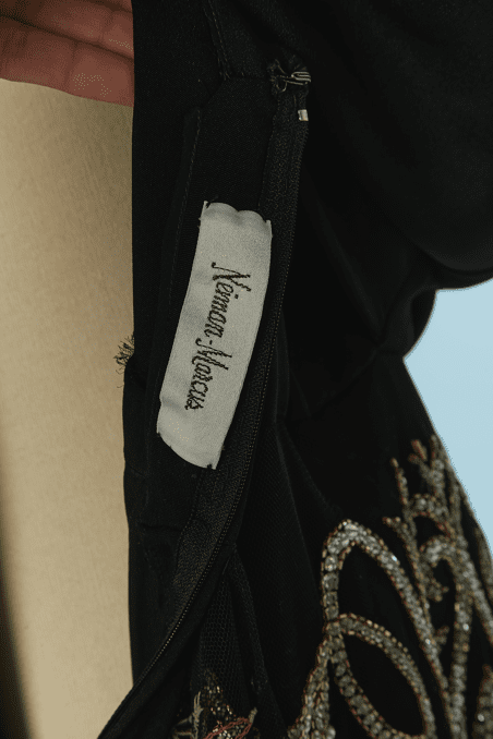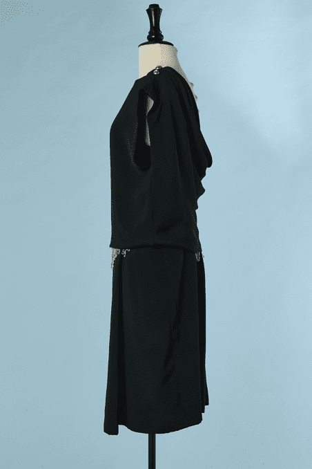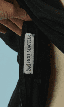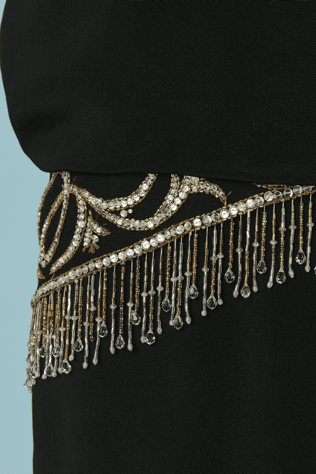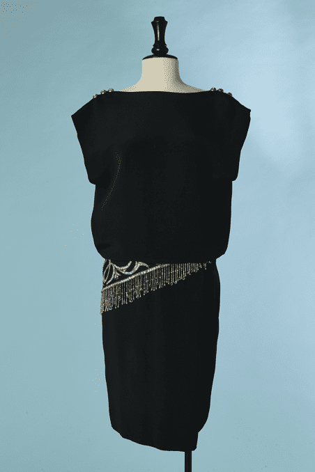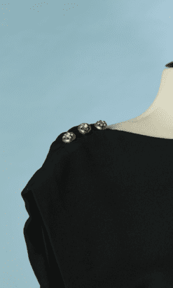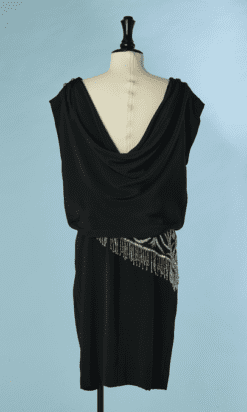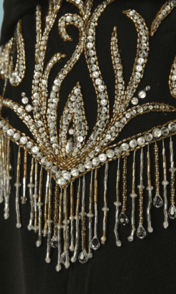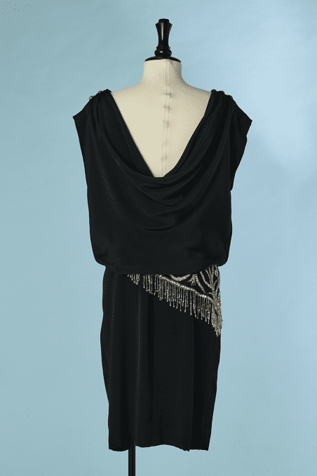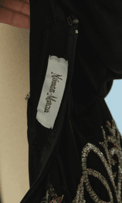 Robe de cocktail Bob Mackie noire brodée de perles à la taille, manches courtes, boutons en strass sur épaules, encolure bateau, dos bénitier décolleté, étiquette blanche et noire
