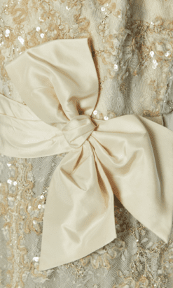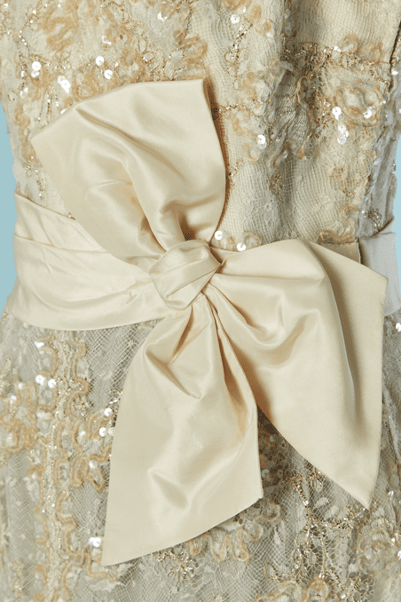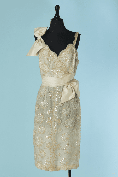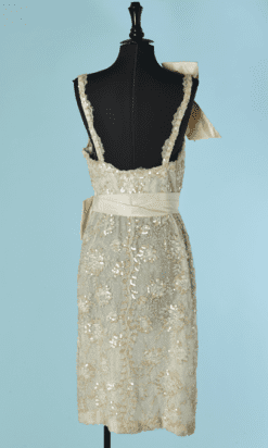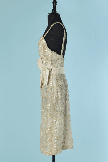 Robe de cocktail Daniel Roland 1960 en dentelle pailletée doublée de soie ivoire, fines bretelles, taille cintrée, nœuds en soie sur une épaule et cousu sur ceinture à la taille, étiquette blanche et noire