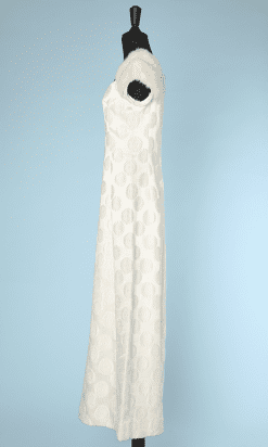 Robe longue de mariée 1960 en satin blanc broché de marguerites et épaules cousues de deux bandes de vison blanc, sans manches et fermeture éclair dos