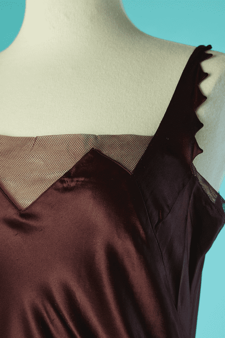 Robe longue du soir 1930 en satin de soie prune, à bretelles découpées de triangles, empiècement en tulle sur la poitrine, découpes en triangles de tailles différentes sur plusieurs parties de la Robe, dos nu