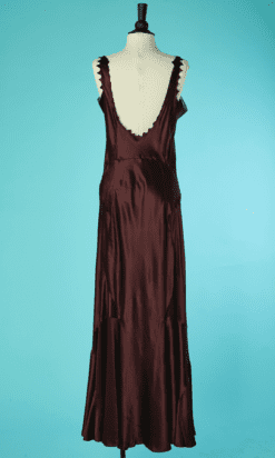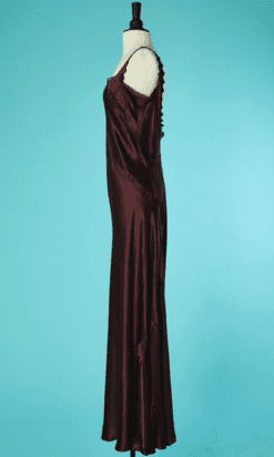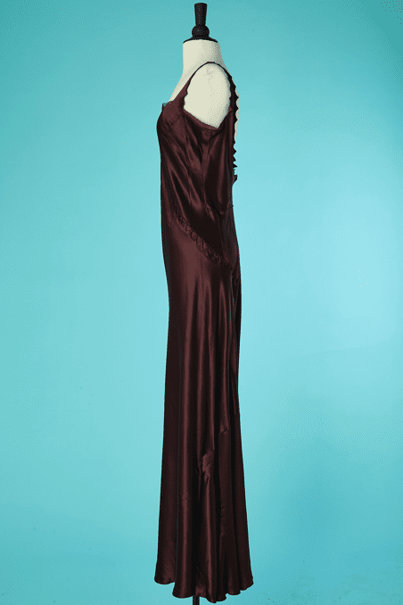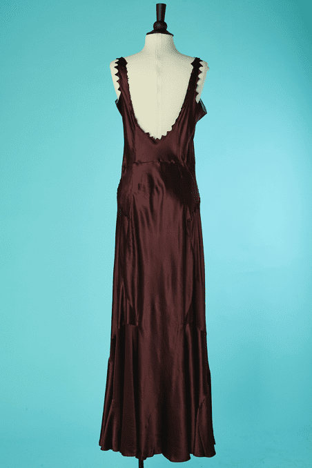 Étiquettes : Robe du soir 1930, Robe du soir 1930 en satin de soie, Robe du soir 1930 en satin de soie avec dos nu, Robe du soir 1930 en satin de soie prune, Robe longue du soir 1930