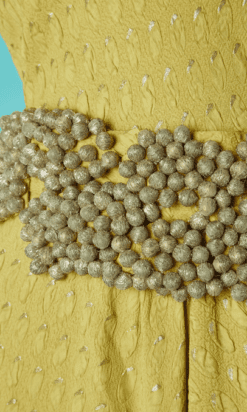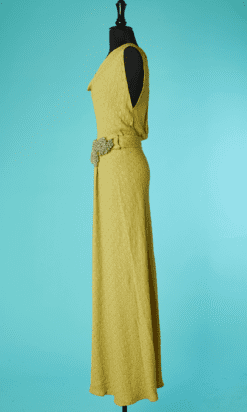 Robe du soir 1936 attribuée à Jeanne Lanvin, en crêpe façonné jaune broché or, sans manches, encolure bénitier en V, ceinture grappe de raisins en boules recouvertes de lamé argent, dos avec une ouverture au centre fermé par un bouton sur la nuque, cintrée à la taille, évasée à partir des hanches