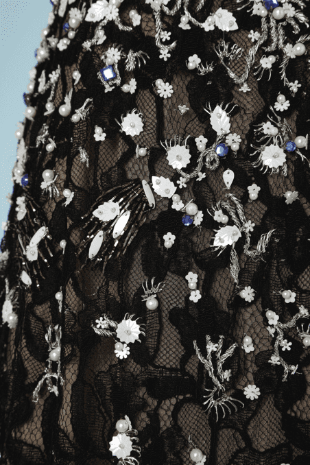 | Agréments | Broderies de paillettes et perles, Dentelle brodée de perles |