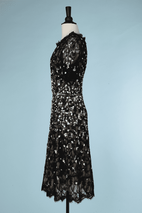 Robe en dentelle noire Oscar de La Renta, brodée de perles de tailles et de formes diverses blanches, strass bleutés, encolure festonnée de dentelle, manches courtes, doublure en mousseline nude, fermeture éclair dos