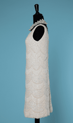 Robe en lainage blanc sans manches 1960 brodée de paillettes blanches irisées, de perles blanches et de franges perlées.