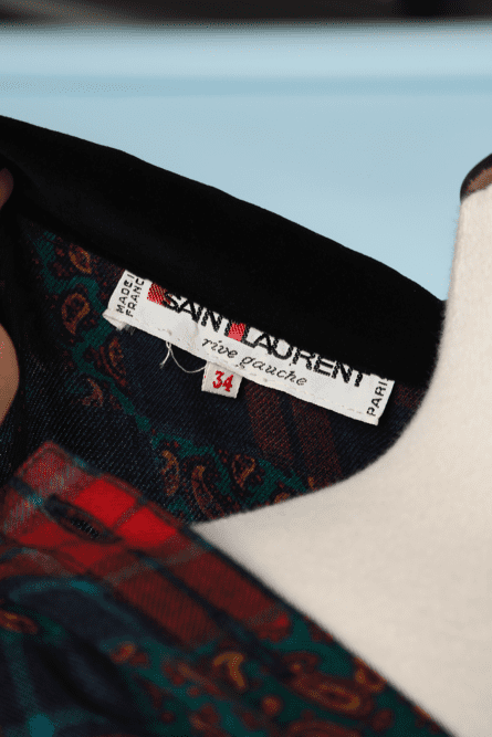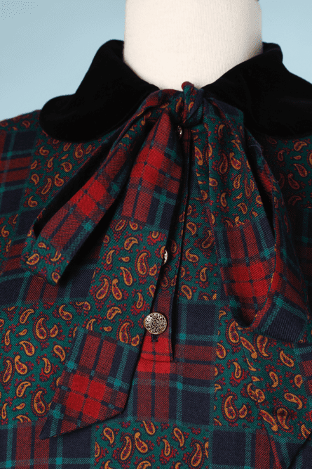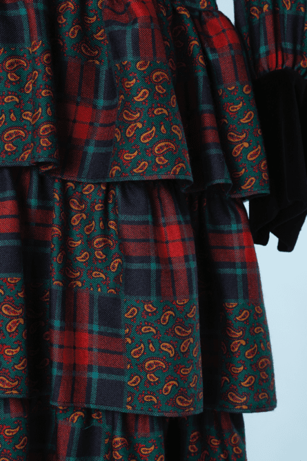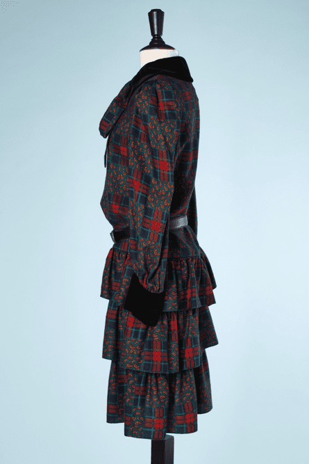 Vintage Saint Laurent rive gauche woolen dress printed with plaid and paisley patterns on a turquoise background, long sleeves with black velvet button cuffs, black velvet tie collar, three flounce hem, belt is sold separately from the dress
