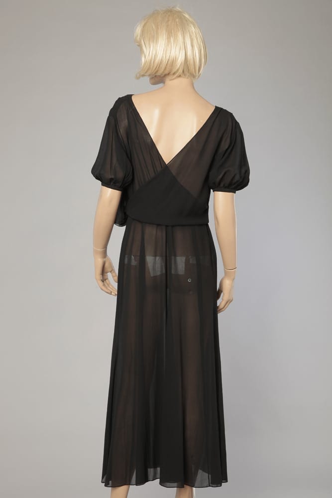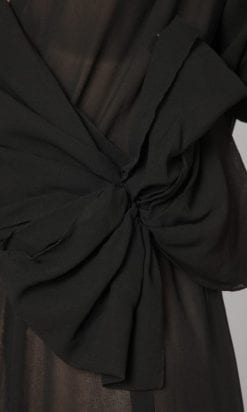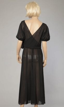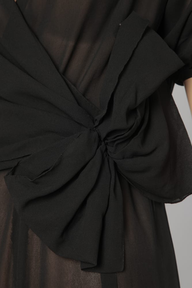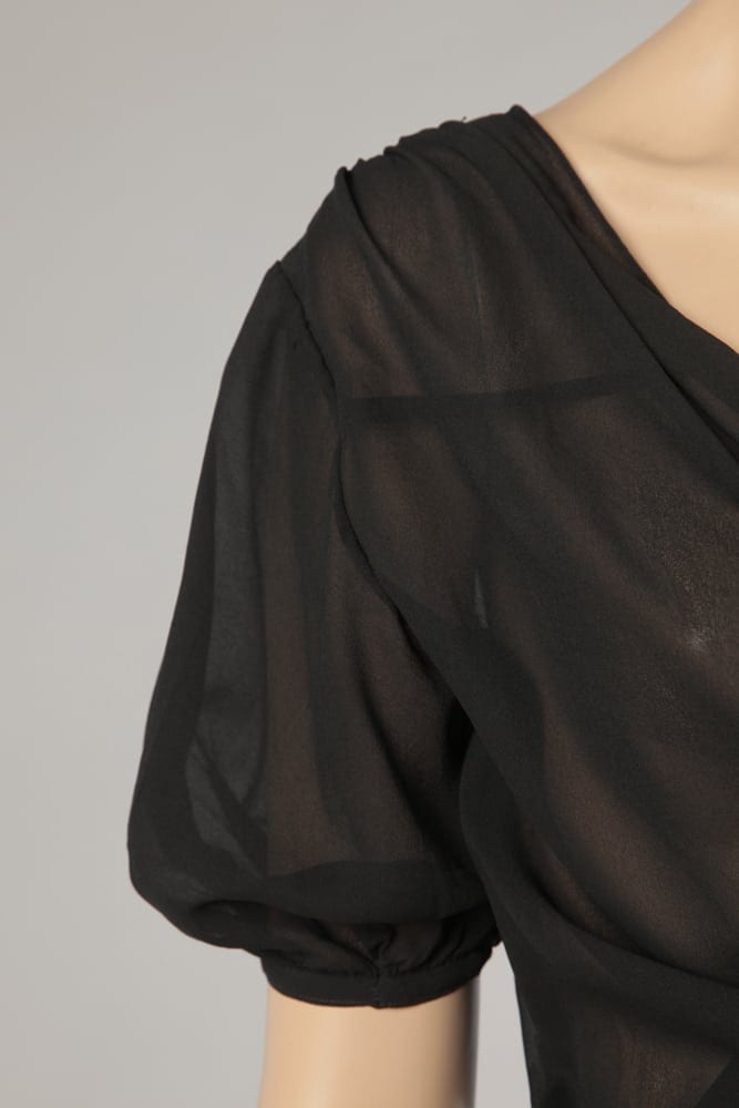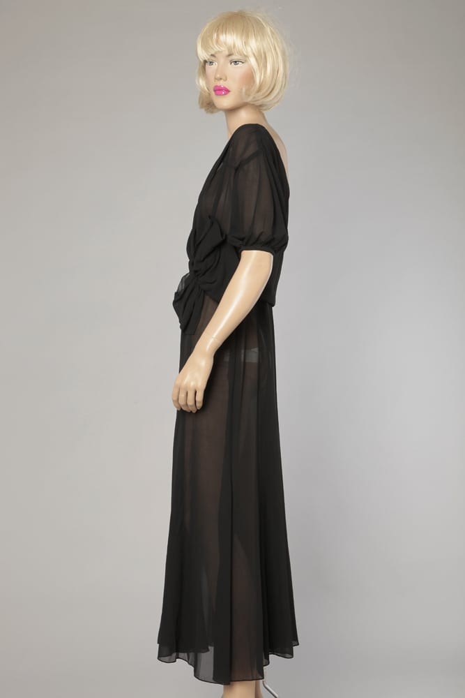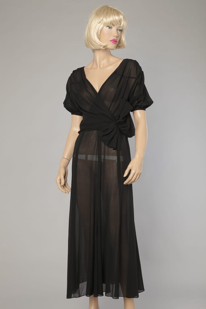Robe 1930 – 1940 en mousseline de soie noire avec un nœud drapé sur le côté de la taille.