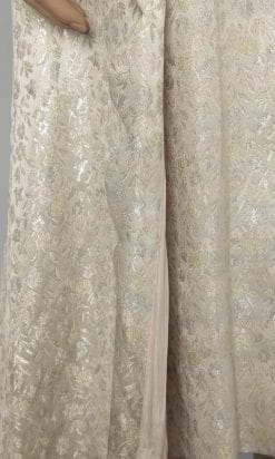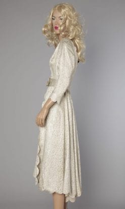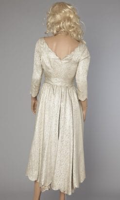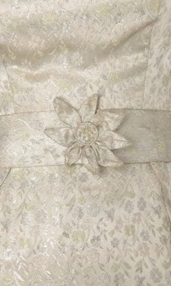 Robe de cocktail 1950 1960 en satin broché argent, avec une surjupe pressionnée à la taille, ceinture dans le même tissu avec fleur.