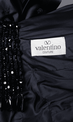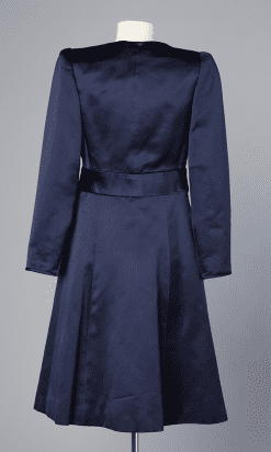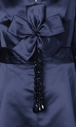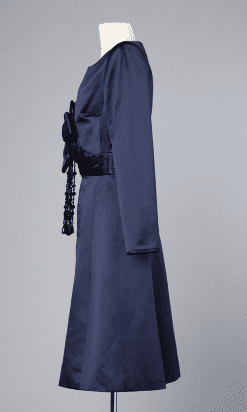 1990 dress in navy blue silk satin with bow belt and black jet beads by Valentino Couture.