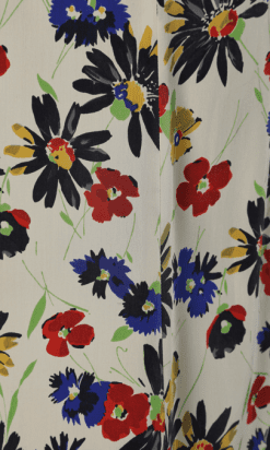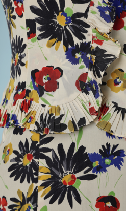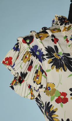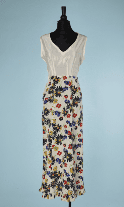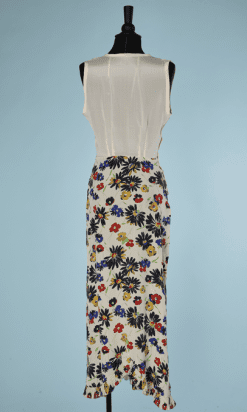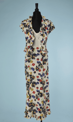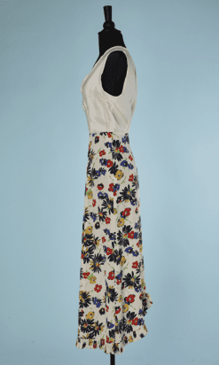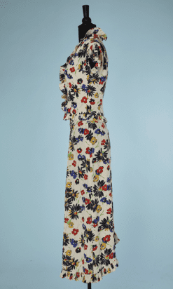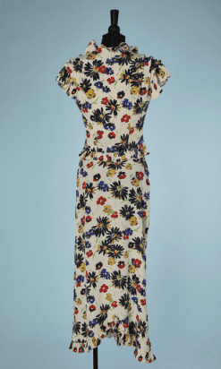 Dress and jacket set 1930 in white silk crepe printed with black, navy, red and yellow flowers. Asymmetrical bottom of the dress.