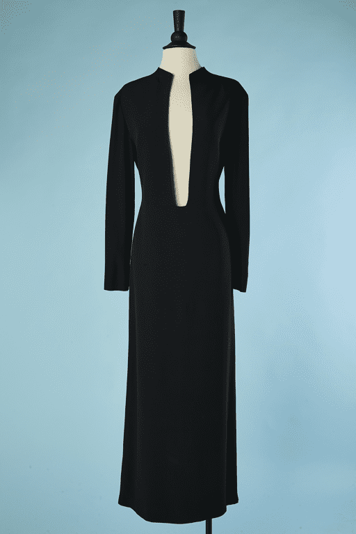 Robe longue vintage Gianfranco Ferre studio en viscose noire décolleté profond jusqu’à la taille, manches longues, fendue en bas derrière