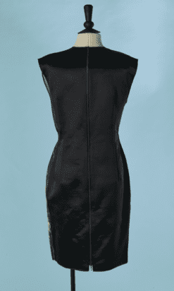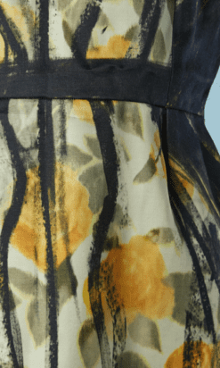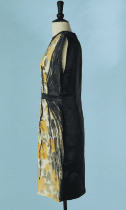 Robe Lanvin les 10 ans par Albert Elbaz, en coton noir et soie grise et jaune imprimée de fleurs, encolure ras de cou, sans manches, taille ceinturée devant, fermeture éclair dos de haut en bas, étiquette noire et or