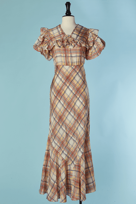 Robe longue 1930 de croisière en taffetas écru imprimé de carreaux écossais rouges jaunes bleus marron, manches courtes bouffantes, large col ourlé d’un volant, taille haute cintrée, moulante jusque sous les genoux, puis large volant évasé cousu en biais