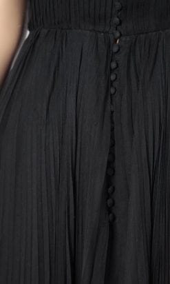 Étiquettes : 1950, Boutons recouverts, Bustier, Bustier balconnet, Bustier plissé, Chevilles, Emmanchures américaines, Mousseline de soie, Noir, Plissé soleil