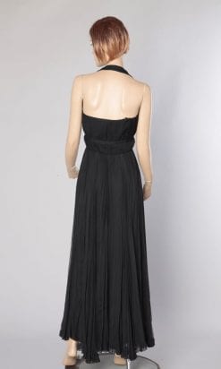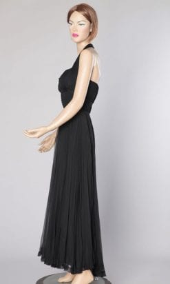 Robe longue du soir des années 1950 en mousseline de soie plissée soleil, bustier balconnet et emmanchures américaines.