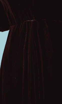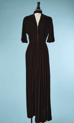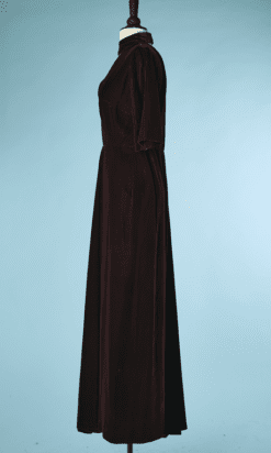 Robe longue du soir 1974 attribuée à Madame Grès, en velours prune, manches au coude, encolure en V et ruban collier de chien, taille cintrée par des plis devant prolongés sous la taille, décolleté dos en V suivi d’une fermeture éclair en métal,