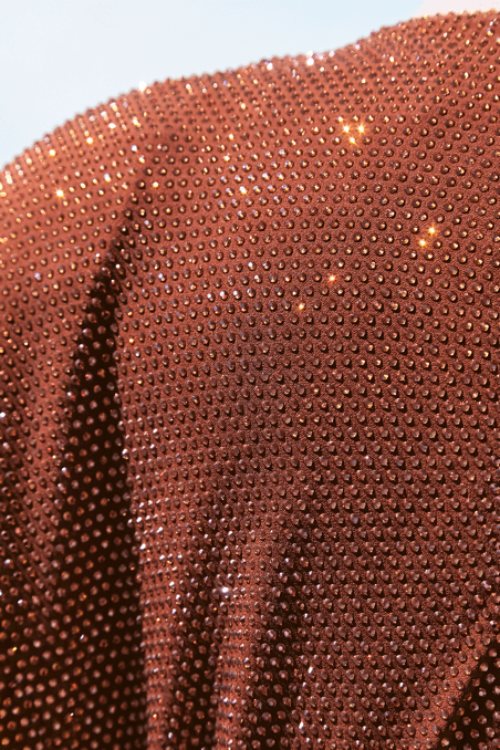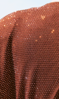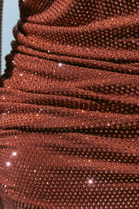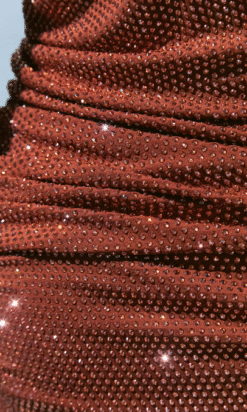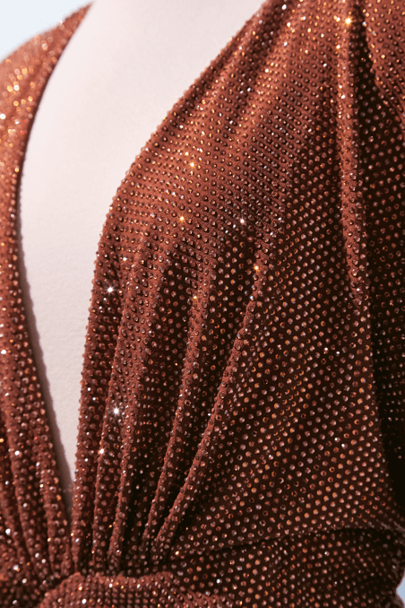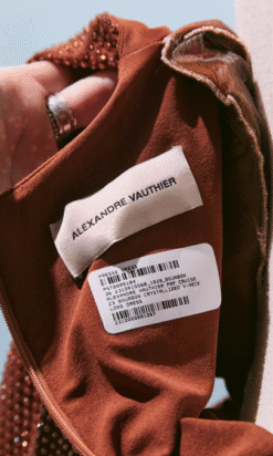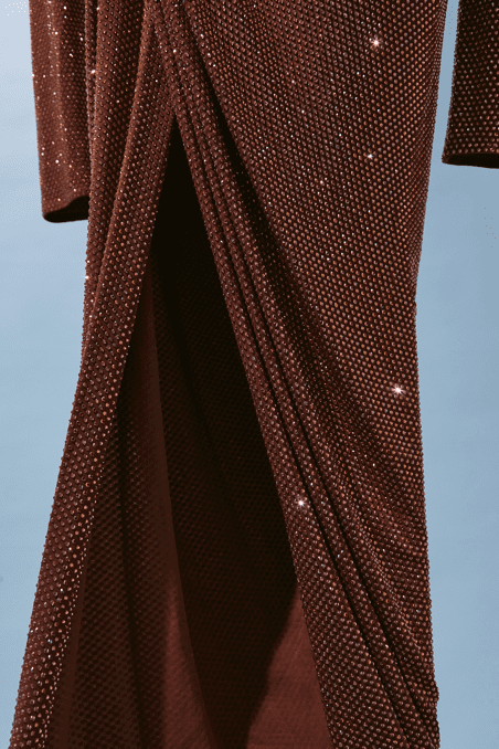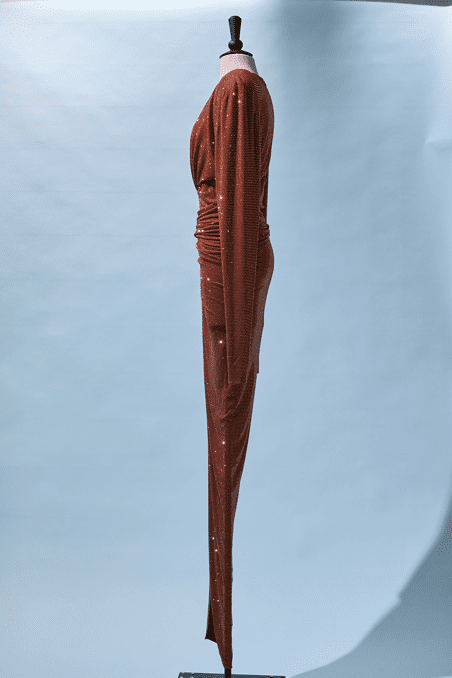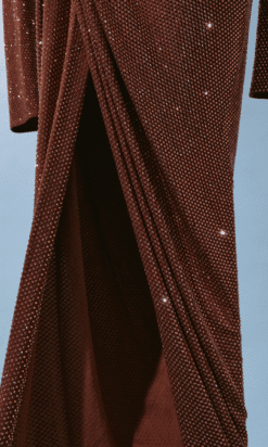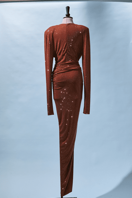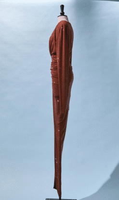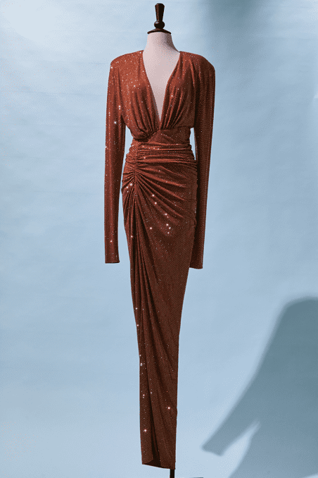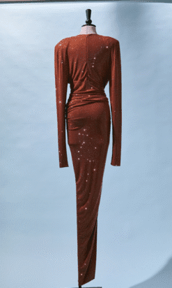 Robe longue du soir Alexandre Vauthier en jersey marron recouvert de strass, manches longues épaulées, décolleté plongeant, taille et hanches plissées sur le côté , fendue devant sur le côté, doublure marron, fermeture éclair milieu dos, étiquette beige et noire