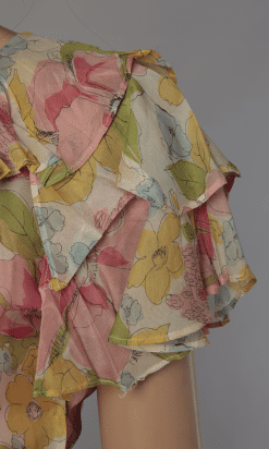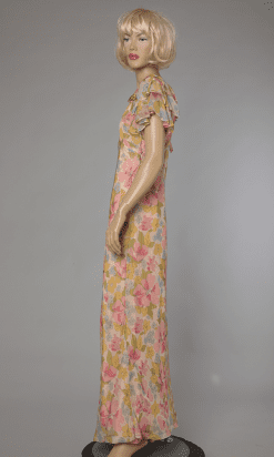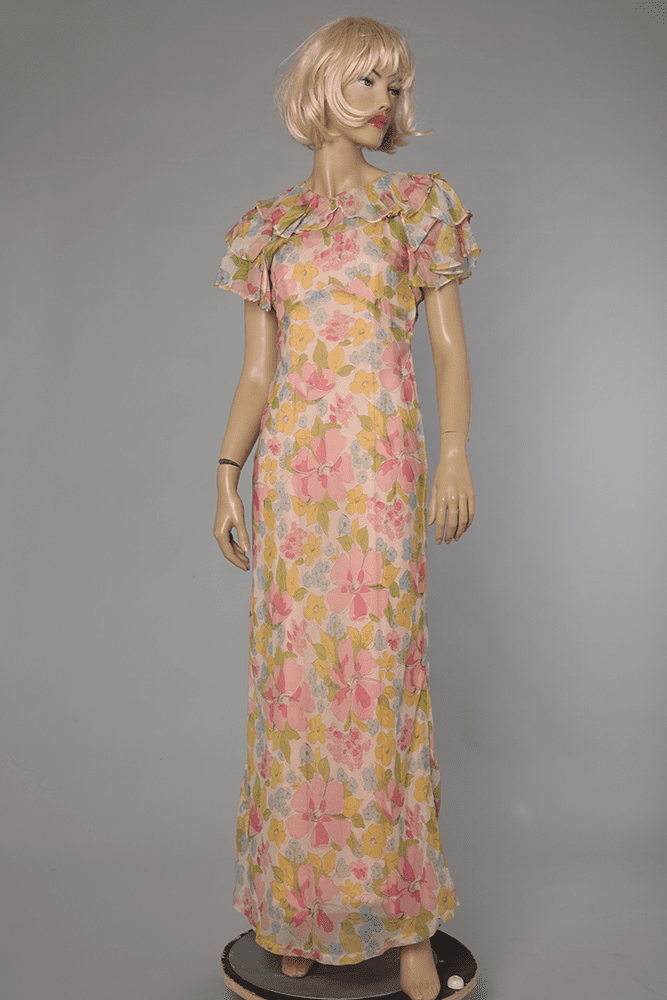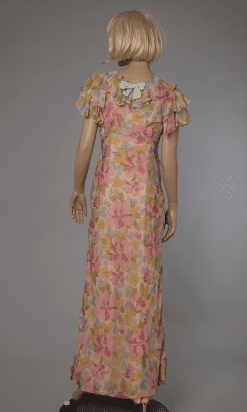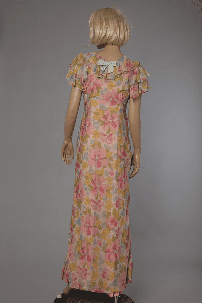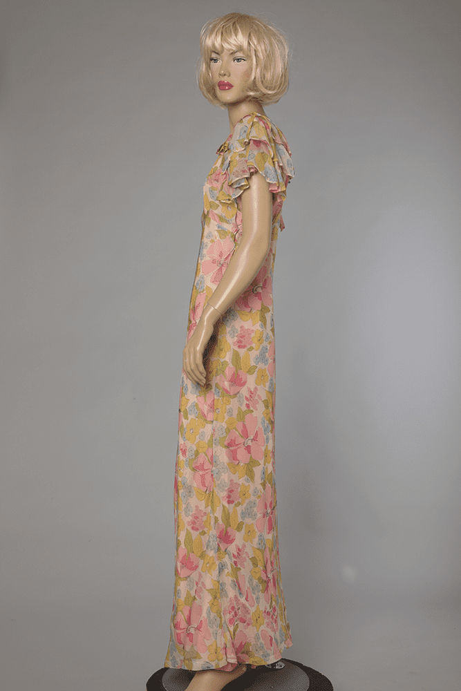 Robe longue de garden party 1930 en mousseline de soie imprimée de fleurs à volants sur les manches et au col.