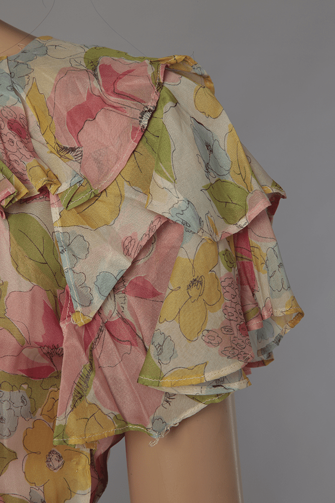 Étiquettes : 1930, Bleu, Chevilles, Garden partie, Jaune, Mousseline, Rose, Vert, Volant au col, Volants aux manches