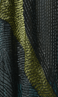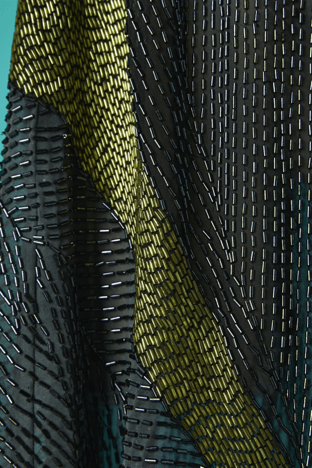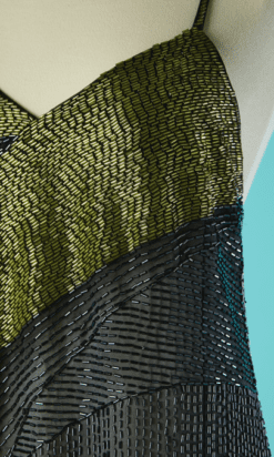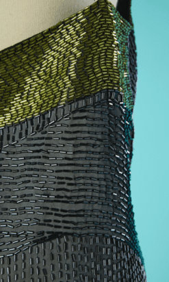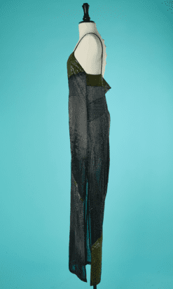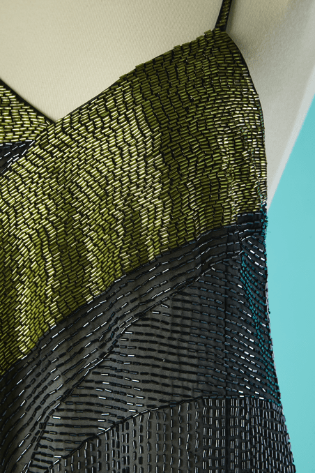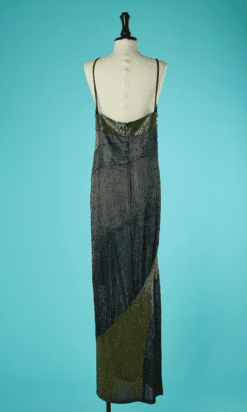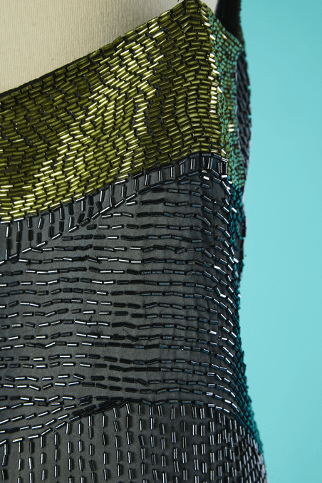 Robe neuve vintage Krizia, du soir en voile gris entièrement brodée de perles tubulaires vertes et grises anthracite, fines bretelles perlées, fendue sur un côté, fermeture éclair dos