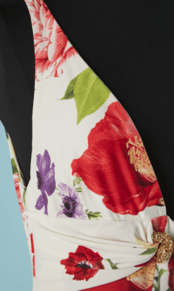 | Agréments | Broches en strass, Décoleté plongeant, Tissu signé, Imprimé coquelicots |
