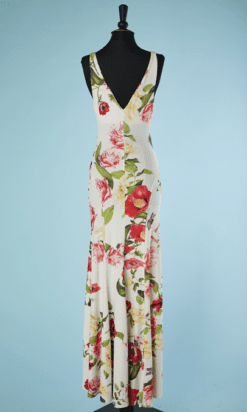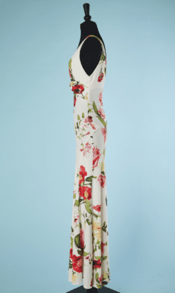 Robe longue Roberto Cavalli, vintage, dans une coupe des années 1930, en jersey blanc imprimé de coquelicots, bretelles, grand décolleté devant et dos en V, broche en métal doré strassé, moulante jusqu’aux hanches, tissu marqué Roberto Cavalli