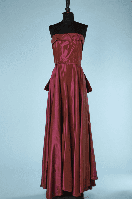 Robe longue du soir 1950, bustier, en faille de soie changeante rose et marron, large plis sur bustier, large double nœud de la taille aux fesses, grande ampleur de jupe pouvant être juponnée