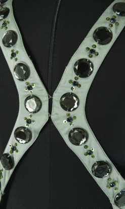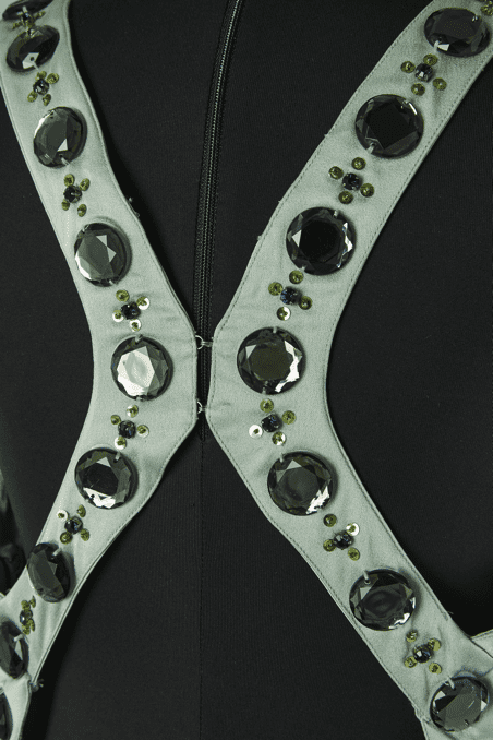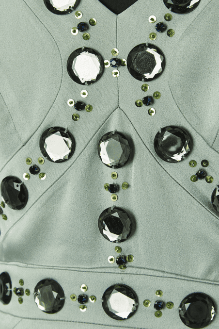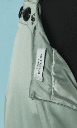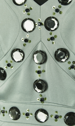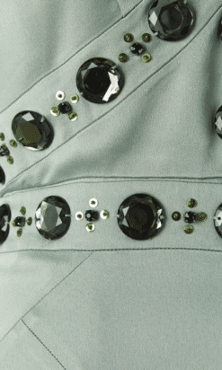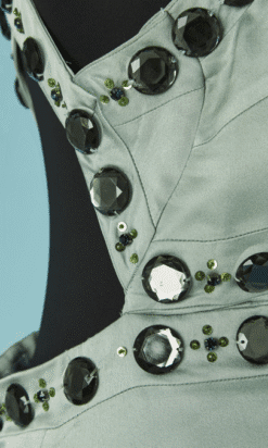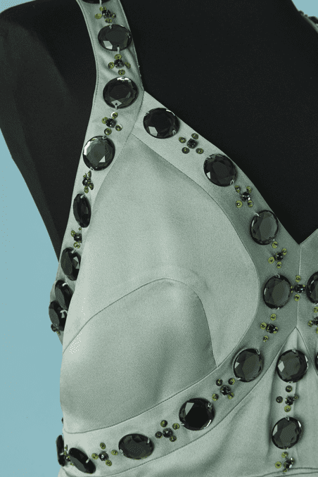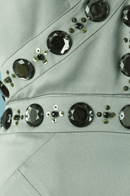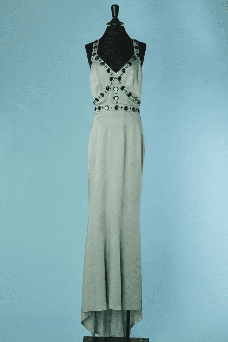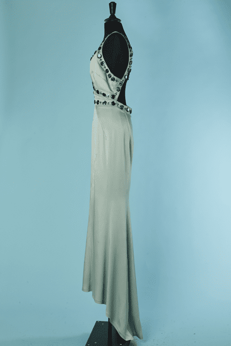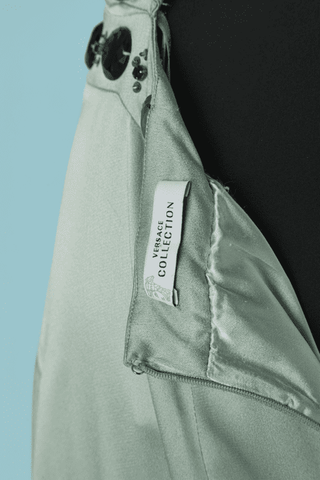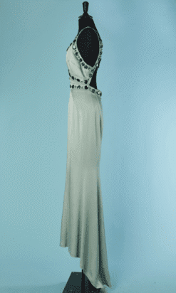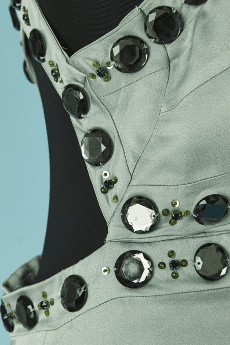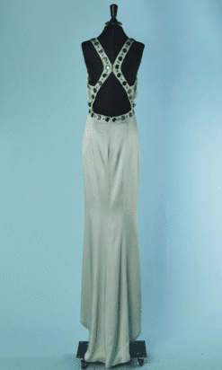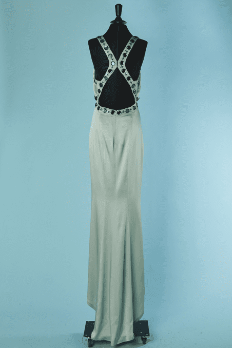Robe longue Versace Collection du soir, en satin vert d’eau cousue de cabochons en strass gris et paillettes surmontées de perles, bretelles avec crochets attachées dans le dos, coupe sirène avec traine