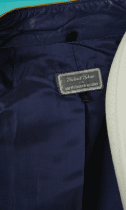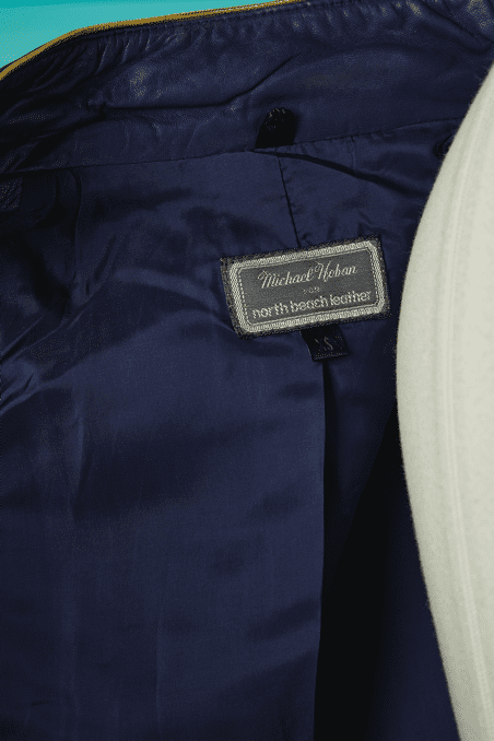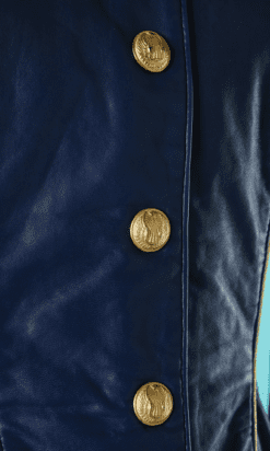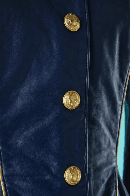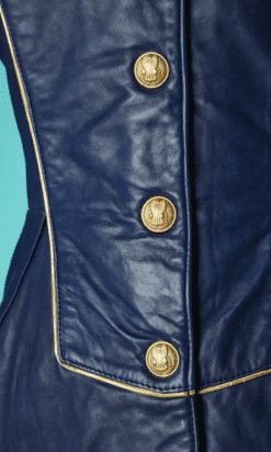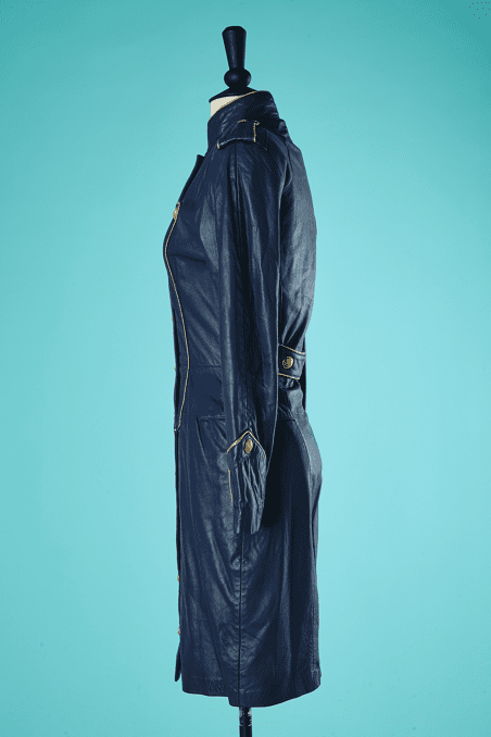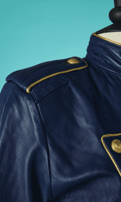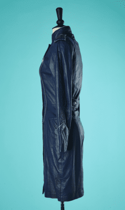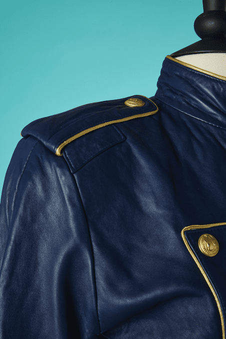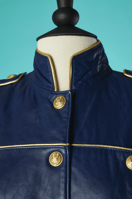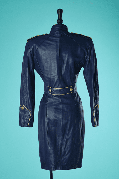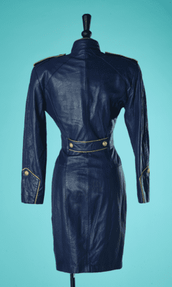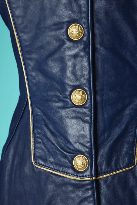 Robe Michael Hoban circa 1980-90 en cuir bleu avec liseré et boutons dorés, manches longues épaulées, taille cintrée, pattes boutonnées sur épaules, martingale dos boutonnée