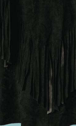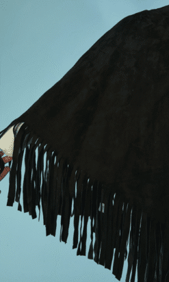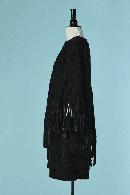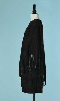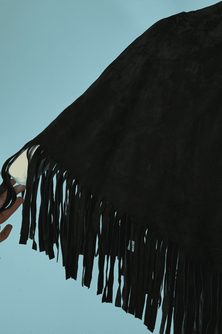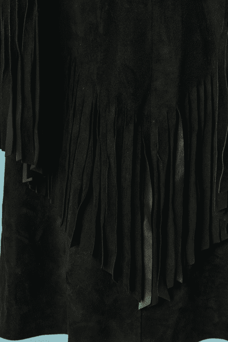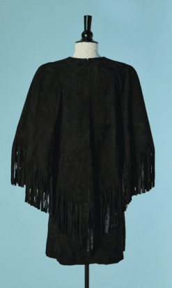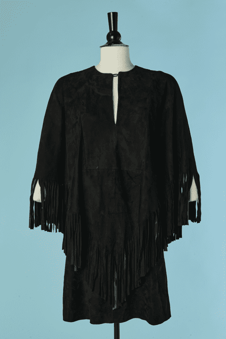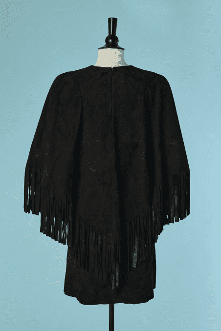 Robe poncho Christian Dior par Maria Grazia Chiuri en daim noir à franges, Robe droite sans manches cousue d’un poncho à franches recouvrant au 3/4 la robe, encolure ras de cou avec échancrure fermée par un bouton, fermeture éclair milieu dos, étiquette blanche et noire