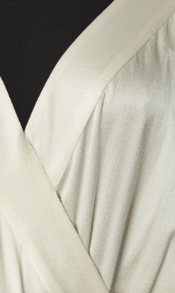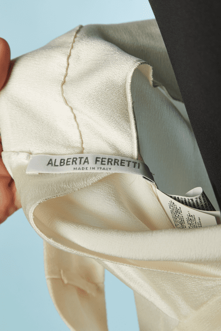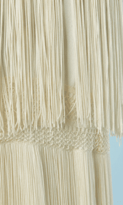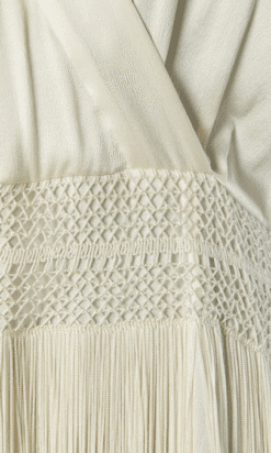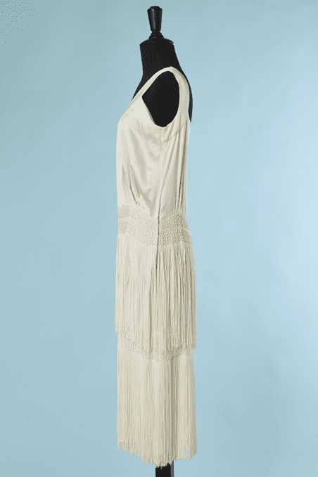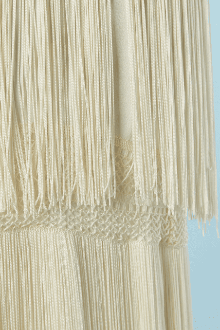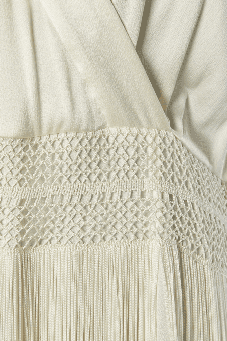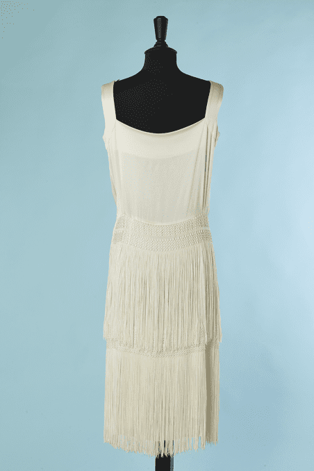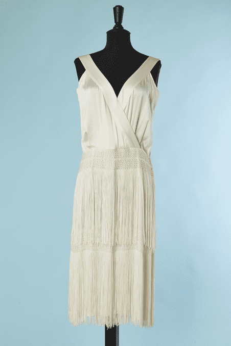 Off white silk cocktail dress with passementerie and silk fringes. Snap covered with silk on the left side. Size 40 (It) 36 (Fr) but fit M