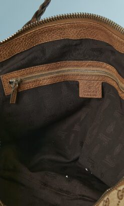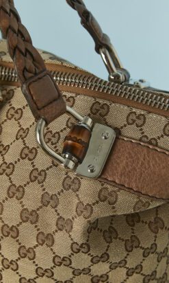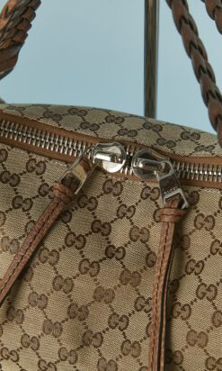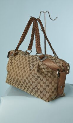 Sac 48 heures Gucci grand modèle vintage en toile beige et marron et cuir marron, anses en cuir tressé, anneaux en métal argenté, double fermeture éclair centrale, doublure en tissu marron, poche intérieure zippée