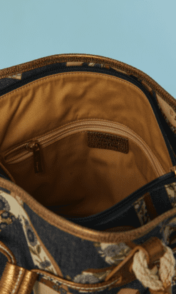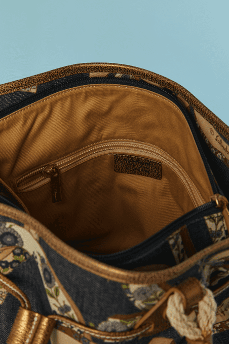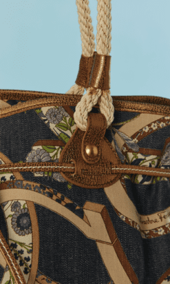 Sac cabas Salvatore Ferragamo en jeans bleu foncé imprimé de fleurs, anses en corde, doublure en tissu ocre, poche intérieure zippée, fermeture éclair milieu, petite tache marron de colle sur anse