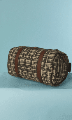 Sac 48 heures Guy Laroche vers 1970 en toile écrue monogramme marron foncé, anses et courroies en cuir marron, fermeture éclair sur le dessus, petite poche sur le côté Taille 27x16x15