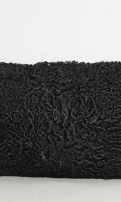 Pochette 1940 en astrakan noir avec gros pompon en soie à franges cousu sur le sac.
