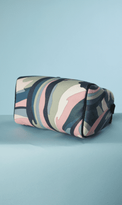 Sac polochon Pucci vintage en cuir imprimé blanc bleu rose et vert, anses en cuir marine, fermeture et anneaux en métal doré, poche intérieur, toile signée Emilio