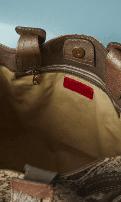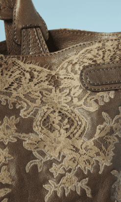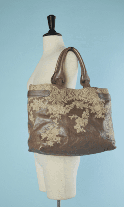 Sac Valentino Garavani en cuir mordoré incrusté de dentelle beige sur les deux côtés, deux anses en cuir pour un porter main, poche intérieure zippée