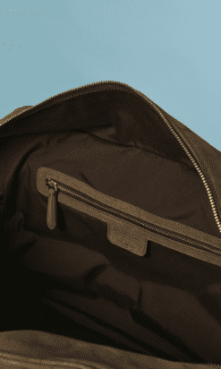 Sac vintage Christian Dior en daim kaki avec anneaux dorés, porté main avec deux anses, poches latérales, fermeture éclair centrale en métal doré, poche intérieure zippée, doublure marron, numéro sur étiquette intérieure N° 00MA0068