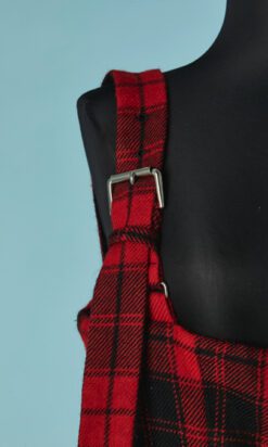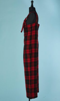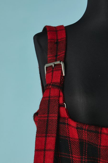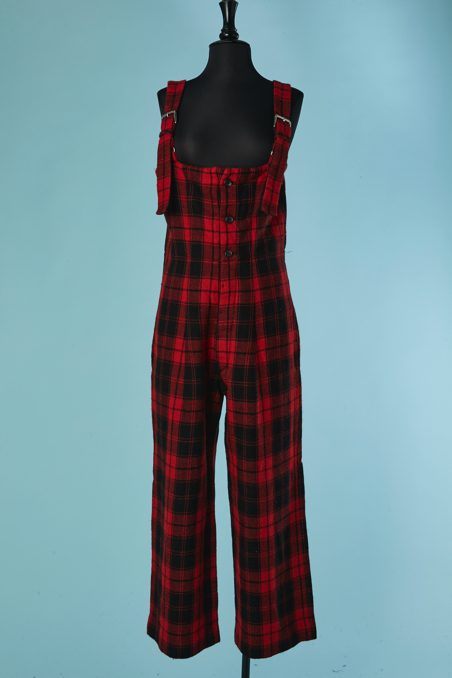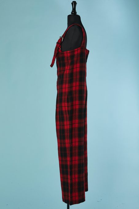 Salopette Yohji Yamamoto en lainage tissé écossais rouge et noir, bretelles avec boucle de ceinture en métal argenté, boutons noirs, échancrure haut du dos, poches latérales, doublure noire, étiquette grise