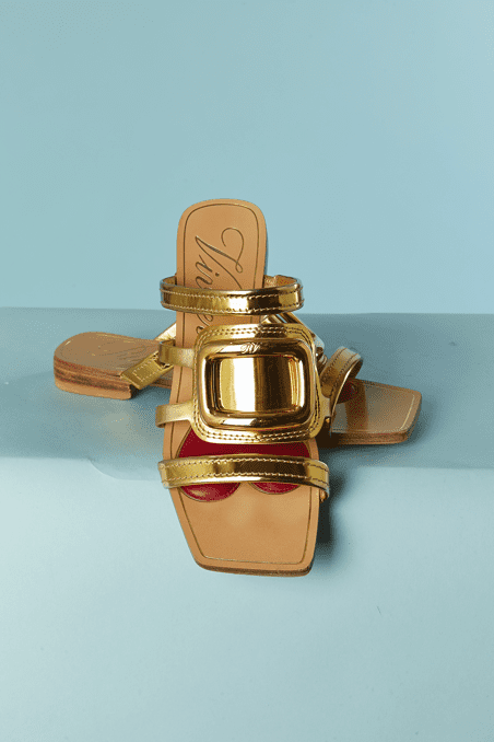 Sandales Roger Vivier en cuir doré, large boucle rectangulaire et quatre lanières avec surpiqûres or, bout carré, talon plat 1cm, cœur rouge sur semelle intérieure Taille 37,5