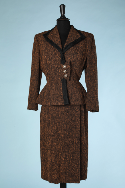 1940’s suit in black mottled brown wool, black passementerie piping sewn around the collar and along the front opening, wide placket sewn with 3 gold metal buttons inlaid with rhinestones, long sleeves with shoulders, basque bending the waist and falling down to the hips, straight skirt, branded Lilli Ann