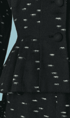 Tailleur 1940 Lilli Ann en laine noire moucheté d’un tissage gris clair, manches longues avec un large revers, large col arrondi cranté au dessus du bouton, taille cintrée, basque à godets, jupe droite fendue derrière, étiquette « an original from Lilli Ann of San Francisco