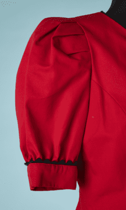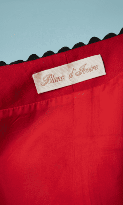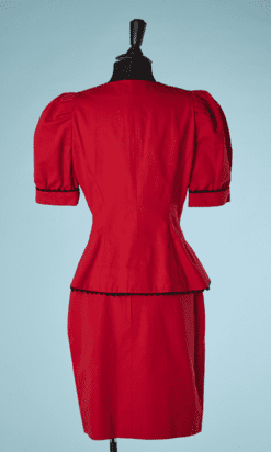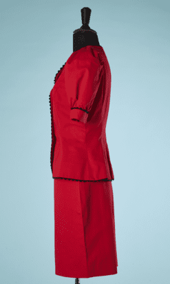 Tailleur 1980 Pierre Balmain » Blanc d’Ivoire » en coton rouge sur-ligné de croquet noir, Veste cintrée, manches courtes ballons avec revers, petit col, boutons en métal gris acier, jupe en amphore