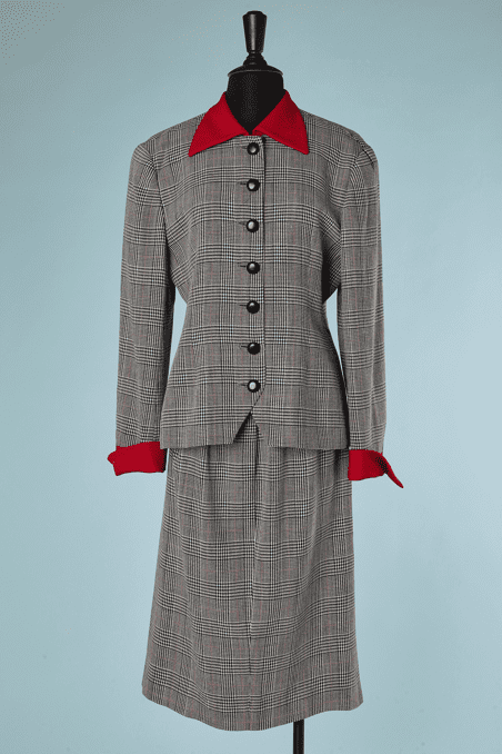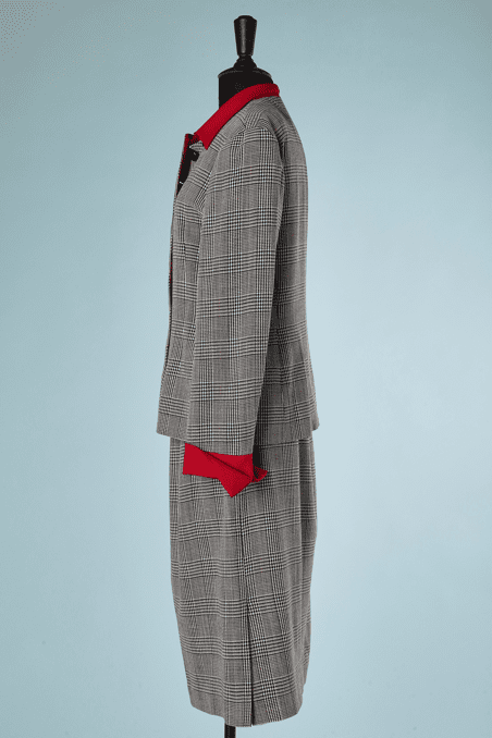 Tailleur Christian Dior vintage en prince de galles, col et et revers de manches en lainage rouge, taille cintrée, boutons noirs, jupe droite plissée sous taille fendue sur les côtés